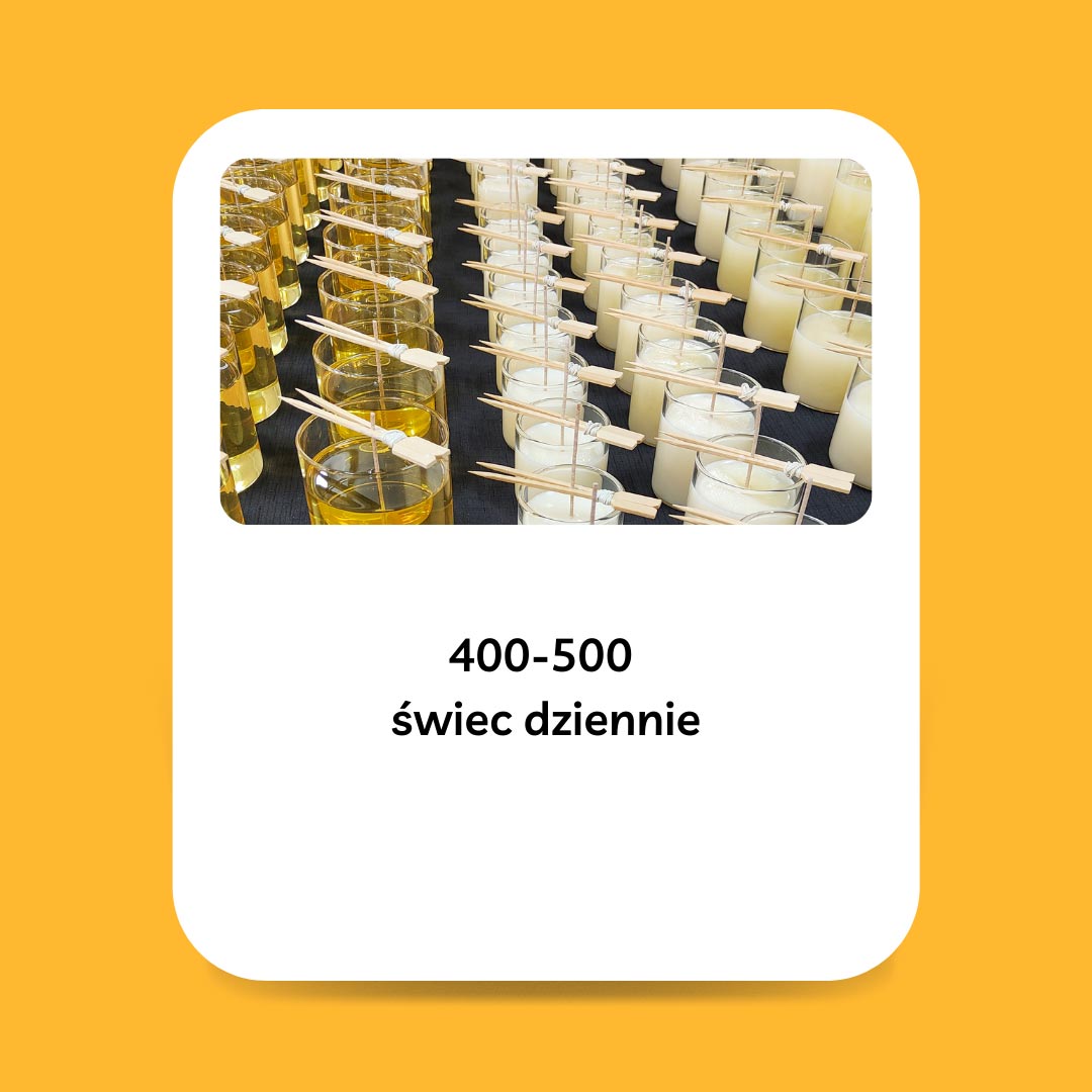 Zurzeit arbeiten wir regelmäßig mit B2B-Kunden zusammen, die unsere Kerzen sowohl auf dem polnischen Markt als auch im Ausland vertreiben. Wir haben keine Mindestabnahmemenge, scheuen uns aber auch nicht vor mittleren Stückzahlen. Unsere Produktionsabteilung ist derzeit gekennzeichnet durch: